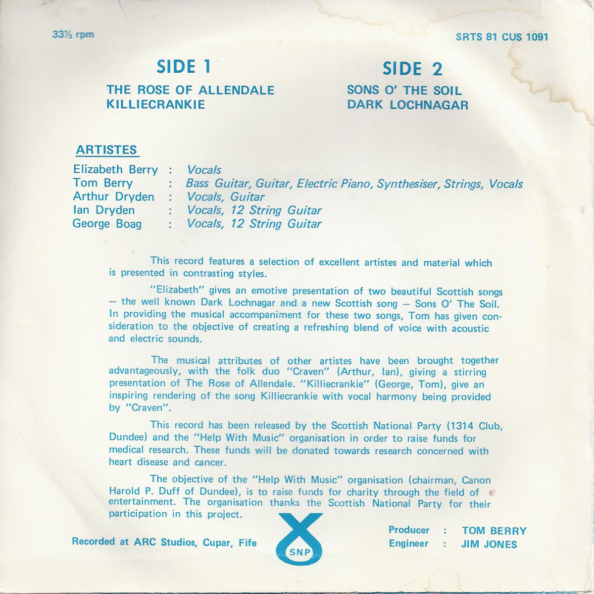 This was a fundraiser for the Dundee branch of the Scottish Nationalist Party, featuring "Elizabeth" (singer Elizabeth Barry, backed by Tom Berry), "Craven" (Arthur and Ian Dryden on vocals and guitars) and "Killiecrankie" (Tom Berry on bass, guitar, piano, synthesiser and vocals, with George Boag on vocals and guitar).